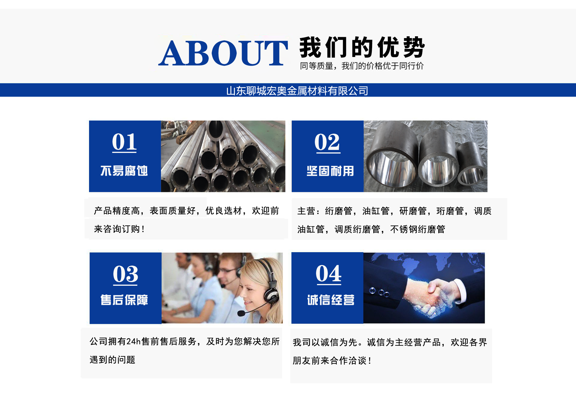 山東聊城宏奧金屬材料有限公司位于風(fēng)景秀麗的江北水城-聊城。地理位置優(yōu)越,交通便利。主營絎磨管,油缸管,研磨管,珩磨管,調(diào)質(zhì)油缸管,調(diào)質(zhì)絎磨管,不銹鋼絎磨管等產(chǎn)品 廣泛應(yīng)用于礦山、起重、船舶、煤炭、運(yùn)輸、化工、科研、軍工等工業(yè)領(lǐng)域。 公司憑借雄厚的實(shí)力,豐富齊全的規(guī)格品種,完善的質(zhì)量保證,合理的價格,優(yōu)質(zhì)的服務(wù),不斷地受到新老用戶及業(yè)內(nèi)人士的肯定和信任,我們本著及用戶之所及,想用戶之所想的服務(wù)宗旨不斷地拼搏,進(jìn)取,在此對多年來支持我們的各行各業(yè)的新老朋友表示由衷的感謝,愿我們今后的合作更加愉快! 歡迎國內(nèi)外新老客戶來公司視察、蒞臨指導(dǎo)工作!...
